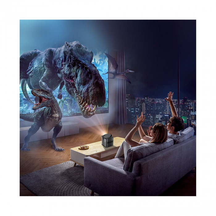Портативный DLP-проектор с настоящим разрешением 1920×1080, яркостью 500 ANSI lm и встроенной батареей 15000 мА·ч. Поддерживает автофокус по технологии TOF, автоматическую/ручную коррекцию трапецеидальных искажений, беспроводную трансляцию с iOS/Android/Windows и работу на Android OS.