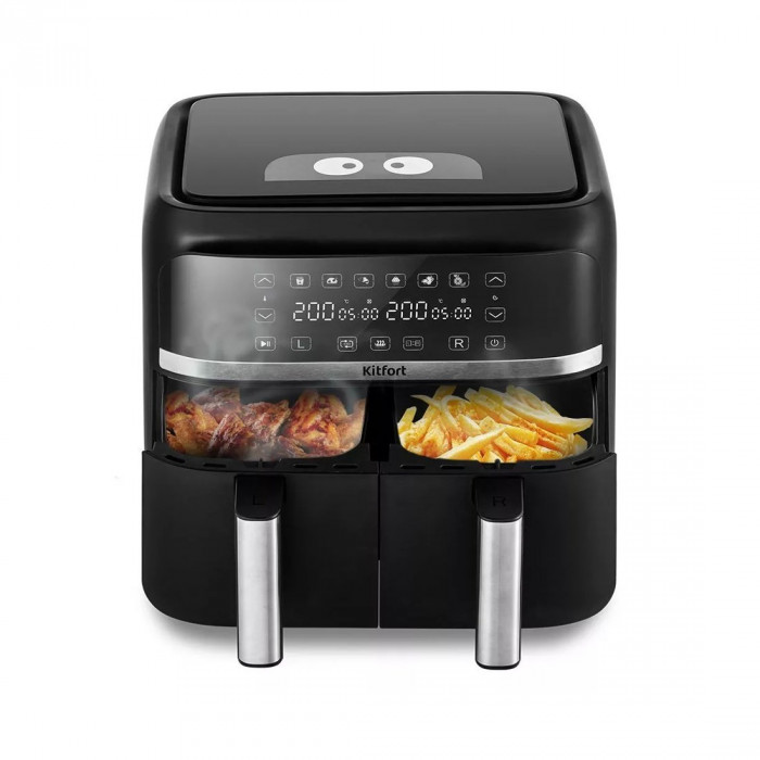 Современный аэрогриль КТ-2248 с 2 раздельными нагревателями и 2 поддонами интересен стильным дизайном, а также позволяет готовить большинство продуктов без добавления масла, а также может использоваться как сушилка для фруктов и овощей.Аэрогриль готовит одновременно 2 разных блюда!