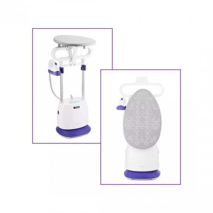 Вещи можно вешать на плечики, на обычную вешалку, подвешенную к отпаривателю, или разложить их на гладильной доске. Она сделана из материала, который пропускает пар и может быть установлена горизонтально или вертикально. Утюжок ставится на держатель.Вертикальное и горизонтальное отпаривание, сухая глажка
