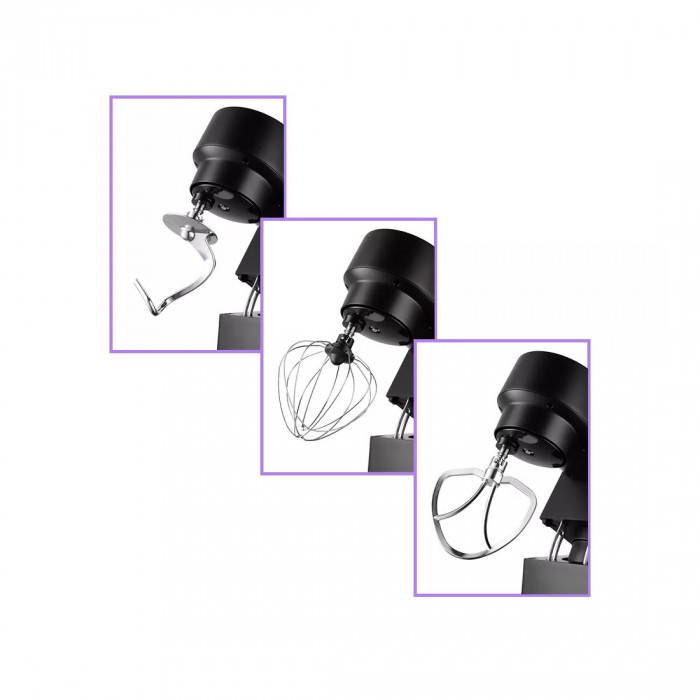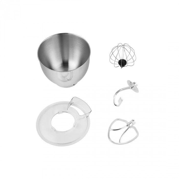 В комплекте идут венчик для взбивания, крюк для замеса крутого теста, насадка для смешивания и приготовления пюре. Форма насадок и чаши подобраны так, что почти при любом количестве продуктов насадка качественно их перемешает.Вместительная чаша на 8 литров!