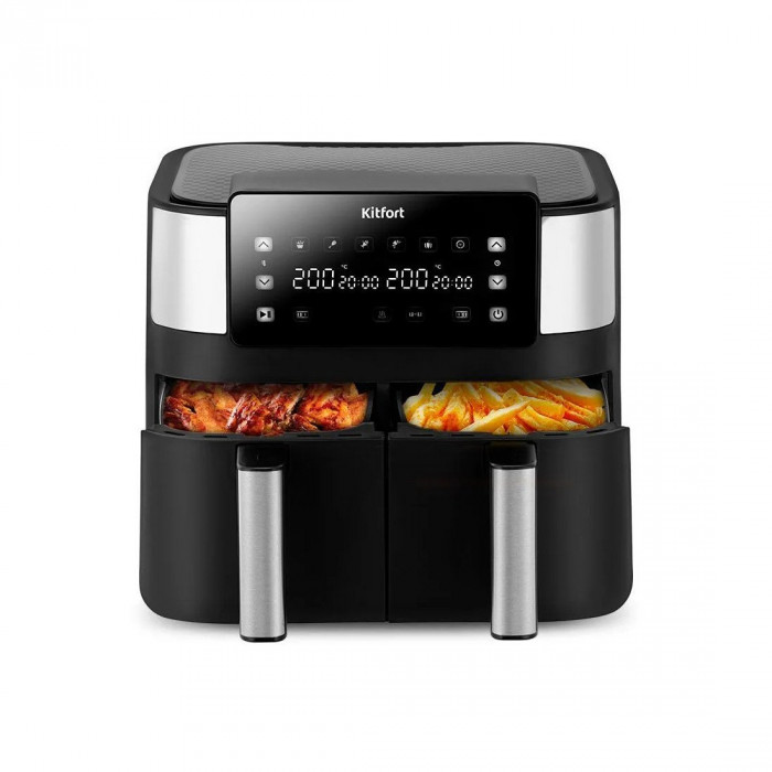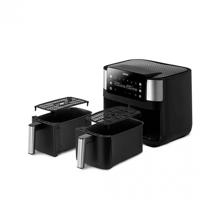 Современный аэрогриль КТ-2259 с 2 раздельными нагревателями и 2 поддонами позволяет готовить большинство продуктов без добавления масла, а также может использоваться как сушилка для фруктов и овощей.