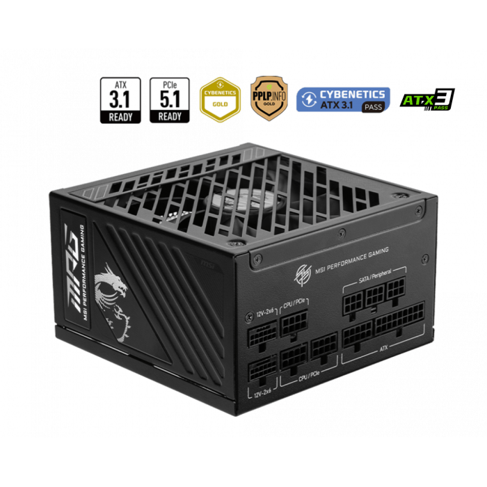 MSI MPG A1000GS PCIE5 II — надёжный блок питания премиум-класса, созданный для топовых систем с видеокартами NVIDIA® GeForce RTX™ 50 Series. Оснащён двумя нативными разъёмами 12V-2x6 и двухцветными кабелями с рельефной оболочкой, которые удобны в укладке и придают сборке аккуратный вид. Имеет сертификацию 80 PLUS Gold, работает тихо, а конденсаторы серверного уровня (105°C) обеспечивают долговечность и стабильную работу. Промышленный уровень защиты (OCP, OVP, SCP и др.) гарантирует безопасность компонентов при любых нагрузках.