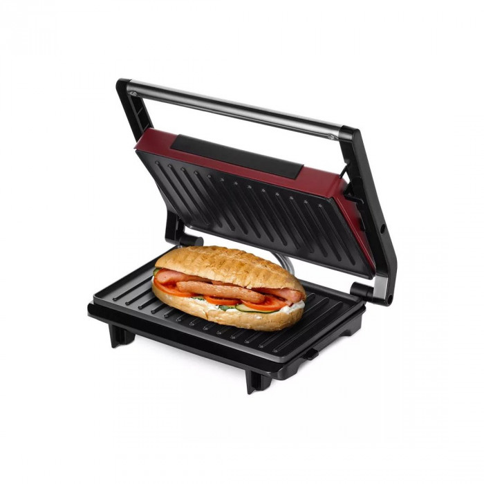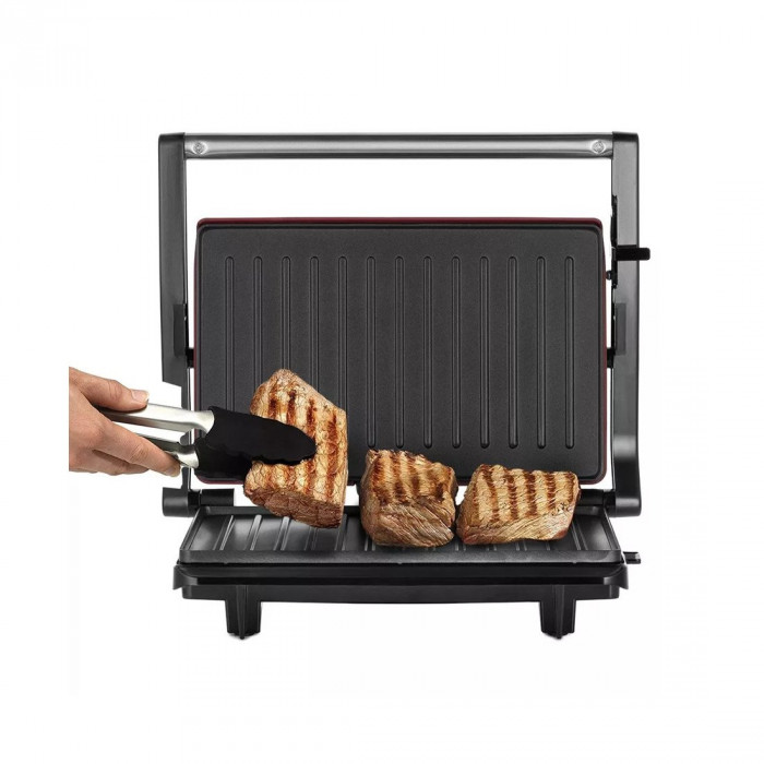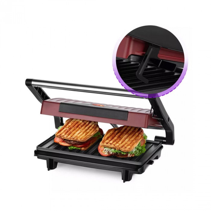Бутербродница оснащена термостатом для поддержания температуры панелей. Специальный фиксатор сбоку устройства удерживает крышку в закрытом положении, что делает готовку, транспортировку и хранение более удобным.