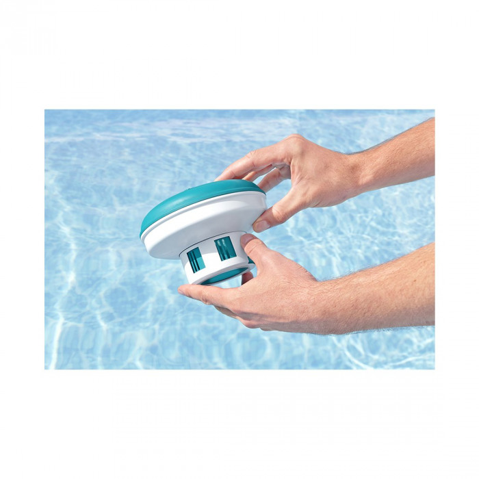 Поддерживайте чистоту воды с помощью плавающего дозатора химических средств для бассейнов Bestway®. Легко добавляйте необходимые таблетки брома или хлора (до 3-х штук) для очистки бассейна в складывающийся плавающий дозатор, чтобы постоянно поддерживать здоровое состояние и химический баланс воды в вашем бассейне. Благодаря регулируемой дисковой шкале этого важного инструмента для обслуживания бассейна вы можете управлять равномерным дозированием химикатов в воду бассейна. Вы можете больше не беспокоиться о чистоте и прозрачности воды в вашем бассейне благодаря плавающему дозатору химических средств для бассейнов Bestway.