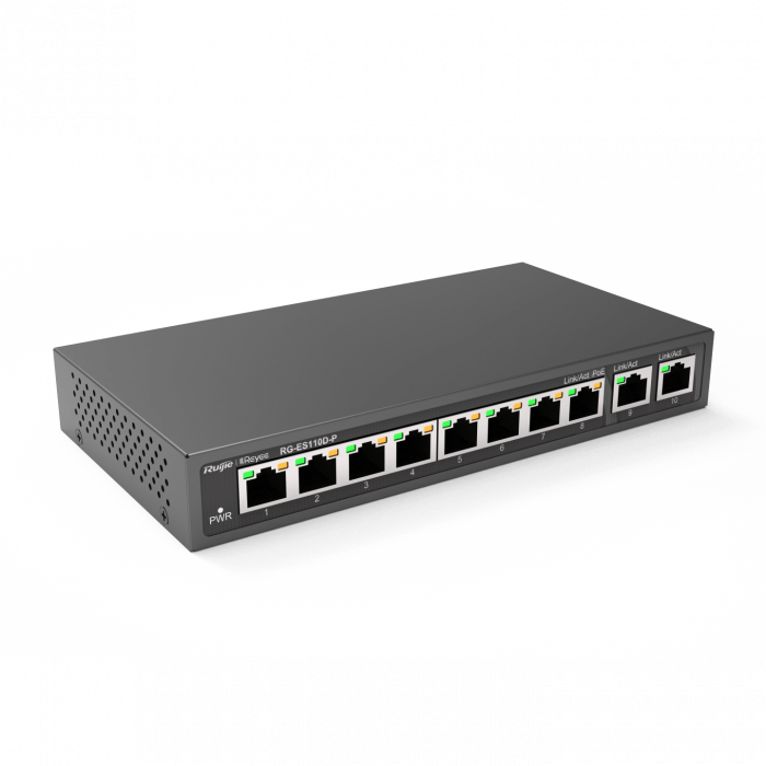 Коммутатор Reyee RG-ES110D-P — неуправляемый PoE-коммутатор с 8 портами 10/100 Мбит/с с поддержкой PoE/PoE+, 2 uplink-портами Gigabit (10/100/1000 Мбит/с) и максимальным PoE-бюджетом 110 Вт для питания PoE-устройств. Он отлично подходит для простого развёртывания сетей видеонаблюдения, Wi-Fi-точек доступа и других PoE-устройств без дополнительной настройки.