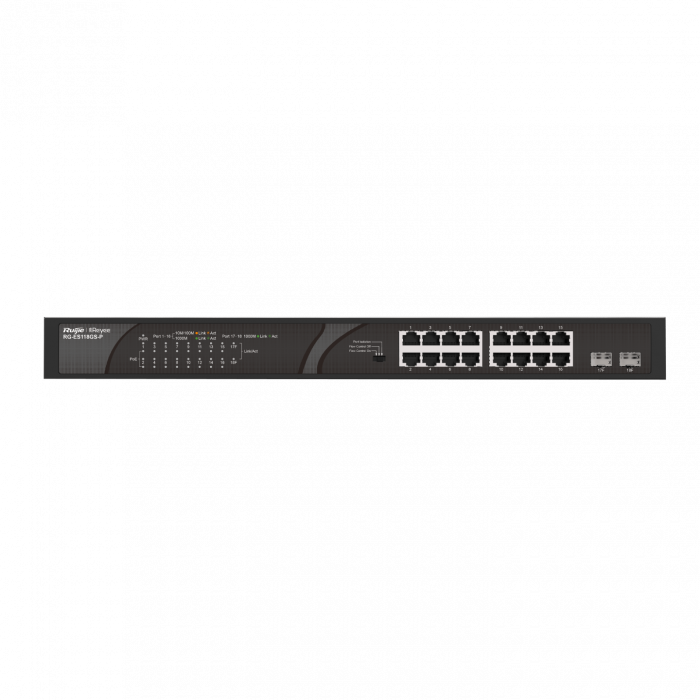 Коммутатор Reyee RG-ES118GS-P — неуправляемый Gigabit PoE/PoE+-коммутатор с 16 портами RJ45 10/100/1000 Мбит/с с PoE, 2-ма SFP-uplink-портами, общим PoE-бюджетом ≈247 Вт и пропускной способностью 36 Гбит/с, обеспечивающи...