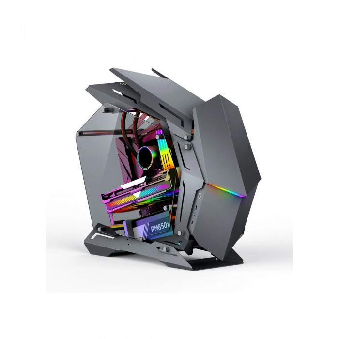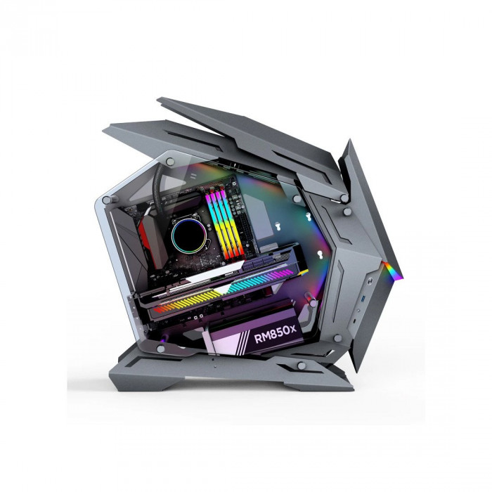 Решение выделяется оригинальным дизайном: корпус выполнен в агрессивном футуристическом стиле, который вызывает ассоциации с космическими кораблями и пришельцами. Левая и правая боковые стенки изготовлены из закалённого стекла толщиной 4 мм, каркас — из алюминия. Предусмотрена многоцветная фронтальная подсветка