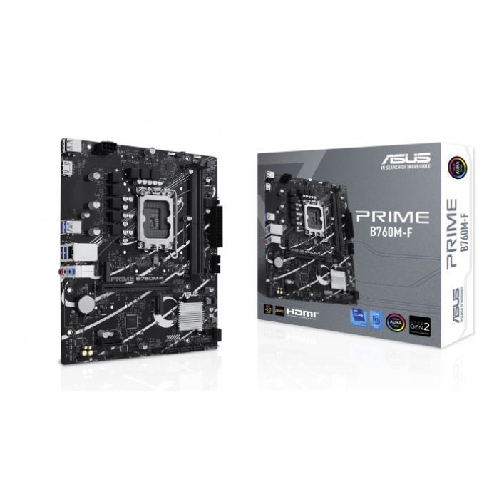 ASUS PRIME B760M-F, an Intel® B760 LGA 1700 micro-ATX motherboard with PCIe 4.0, two PCIe 4.0 M.2 slots, DDR5, Realtek 1Gb Ethernet, HDMI™, SATA 6 Gbps, front USB 5Gbps ports, Aura Sync