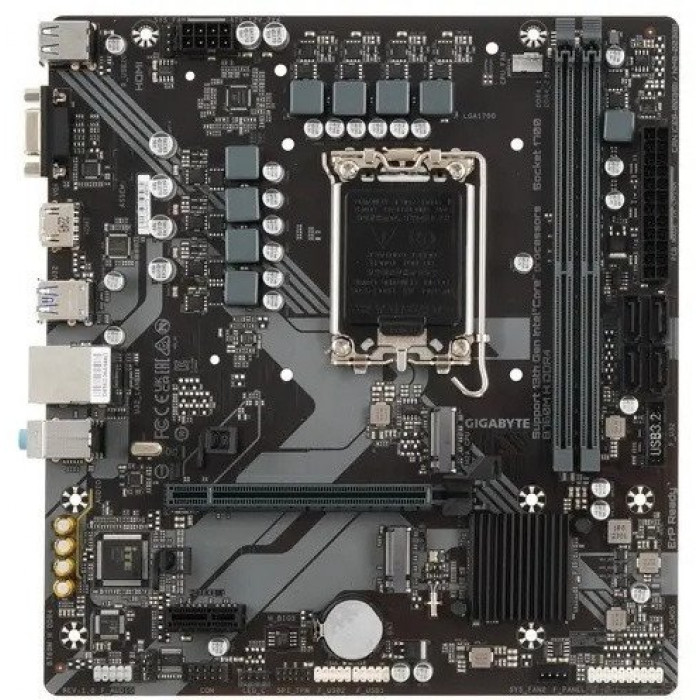 GIGABYTE B760M H DDR4 — материнская плата формата mATX на чипсете Intel B760 с сокетом LGA1700. Поддерживает 2 модуля DDR4, два M.2 накопителя, 4 порта SATA и видеовыходы D-SUB (VGA) и HDMI. Подходит для сборки домашних, офисных и бюджетных игровых систем на базе процессоров Intel 12/13 поколения.