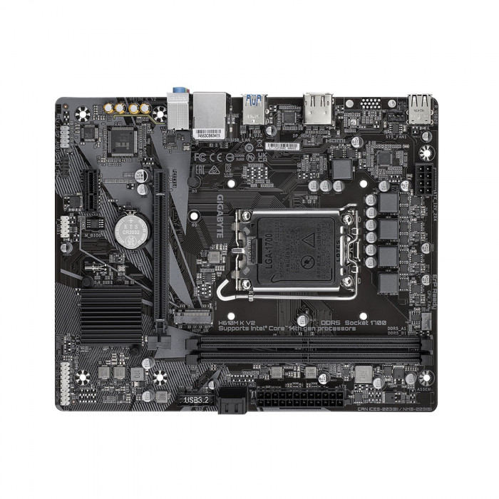 GIGABYTE H610M K V2 — материнская плата формата mATX на чипсете Intel H610 с сокетом LGA1700. Поддерживает до 2 модулей DDR5, слот PCIe 4.0 x16, один M.2 накопитель, 2 порта SATA, видеовыходы HDMI и DisplayPort (DP). Под... Читать далее...