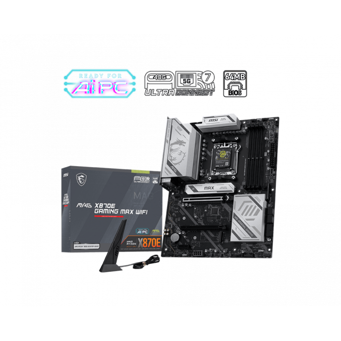 MAG X870E GAMING MAX WIFI разработана для геймеров и представляет собой стабильную, надежную и удобную для самостоятельной сборки основу для ПК. Благодаря новейшим технологиям Wi-Fi 7, 5G LAN, USB 40 Гбит/с, PCIe 5.0, дополнительному питанию PCIe и эксклюзивным функциям EZ DIY, она готова к работе с процессорами AMD Ryzen™ серии 9000.