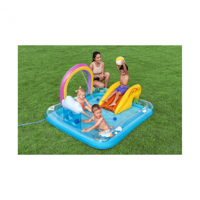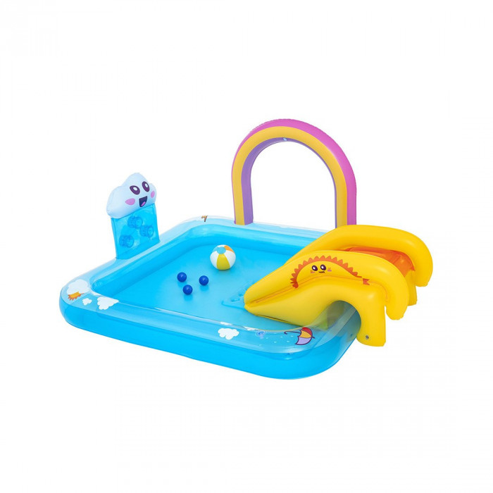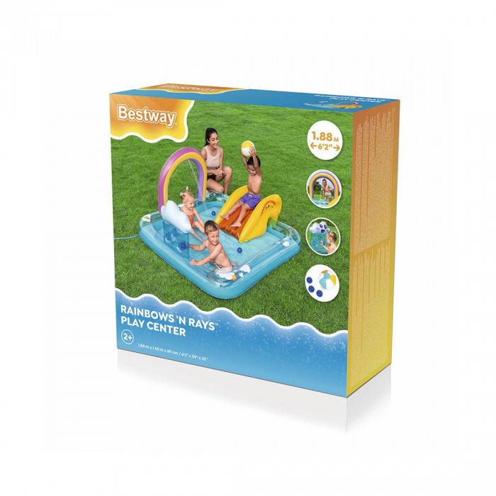 Позвольте своим детям понежиться в лучах солнца с игровым центром Bestway® Rainbows 'N Rays™. В жаркие летние дни дети могут охладиться, пройдя под разбрызгивателем в виде арки-радуги, который легко подключается к садовому шлангу. Они получат массу удовольствия, спускаясь по солнечной горке, приваренной к дну бассейна в целях безопасности. Стенка для сортировки мячиков с милым лицом-облачком доставит им часы веселья, поскольку они смогут развивать мелкую моторику, помещая 3 игровых мячика в отверстия в стенке. Они также смогут поработать над зрительно-моторной координацией, по очереди подбрасывая или отбивая пляжный мяч друг другу. Игровой центр также имеет простой в использовании сливной клапан для выпуска воды из бассейна, поэтому его можно легко демонтировать и поместить на хранение для использования в будущем. Дети могут наслаждаться игровым центром даже без воды круглый год. Проводите больше времени со своим малышом на свежем воздухе в игровом центре Bestway Rainbows ‘N Rays!