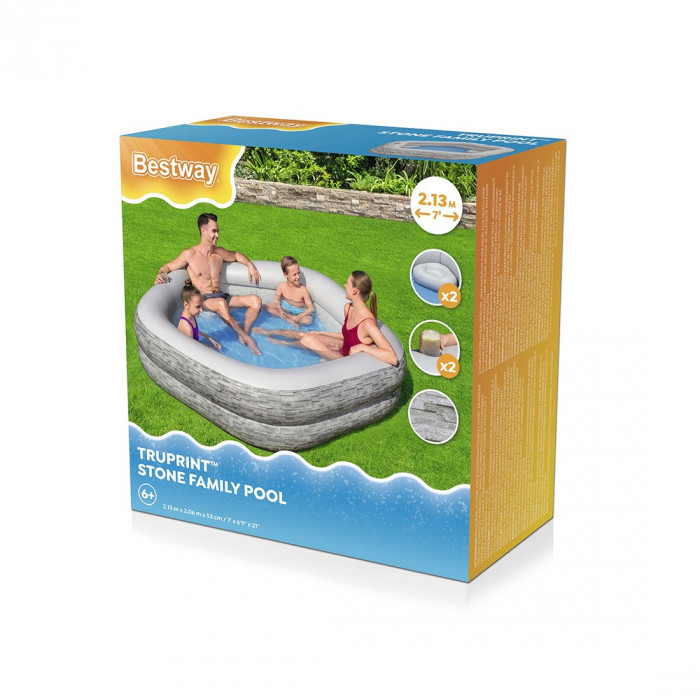 Приготовьтесь к стильным развлечениям на заднем дворе с семейным «каменным» бассейном Bestway® TruPrint™! Семейный «каменный» бассейн TruPrint, разработанный для взрослых или семей с детьми в возрасте от 6 лет и старше, имеет реалистичный принт под каменную кладку на внешней стороне бассейна, который дополнит эстетику любого заднего двора или же добавит некоторую «текстуру» вашему патио. Два одинаковых кольца и очень широкие боковые стенки придают бассейну устойчивость. С двумя мягкими сиденьями и двумя подстаканниками взрослые могут расслабиться и отдохнуть, пока дети играют поблизости. Кроме того, его можно легко надувать, сдувать, сливать и хранить в межсезонье в течение нескольких лет. Качественное времяпровождение с семьей еще никогда не было более удобным, комфортным и изысканным, чем в семейном «каменном» бассейне Bestway TruPrint!