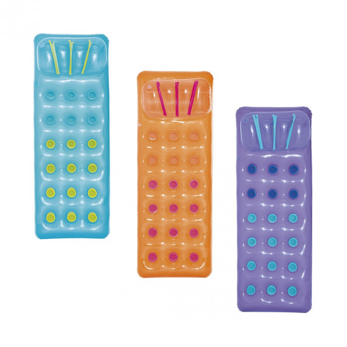 Плавайте и отдыхайте на стильном люксовом надувном матрасе для бассейна Bestway® Summer Colors™. Надувной матрас для бассейна имеет цветной прозрачный верх, под которым видны ярко окрашенные внутренние карманы. Карманы дают дополнительный всплеск цвета, а также сохраняют прохладу и обеспечивают дополнительную поддержку во время плавания. Люксовый надувной матрас для бассейна Summer Colors имеет встроенную надувную подушку с внутренними ребрами жесткости (I-beam), благодаря которой ваша голова будет приподнята и удобно поддерживаться в любое время. Отбросьте свои заботы и наполните дни дополнительным солнечным светом и сезоном брызг. Отдыхать на солнце никогда еще не было так весело, как с люксовым надувным матрасом для бассейна Bestway Summer Colors!