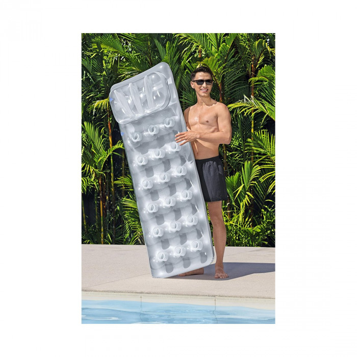 Начните свой отдых в идеальный день у бассейна с надувного матраса для бассейна Bestway® «Серебряный люкс». Благодаря прочной конструкции на основе цилиндрических поддерживающих элементов «coil beam» для дополнительной поддержки и 2 воздушным камерам для дополнительной плавучести вы можете наслаждаться каждым моментом на воде с помощью этого удобного надувного матраса. Расслабьтесь и наслаждайтесь мягкой, наполненной воздухом подушкой и грейтесь на теплом солнце. Благодаря прозрачному верху и прохладному серебристому цвету вам понравится внешний вид надувного матраса для бассейна, на котором вы будете принимать солнечные ванны. Отдыхать на солнце никогда еще не было так весело, как с надувным матрасом для бассейна Bestway «Серебряный люкс»!