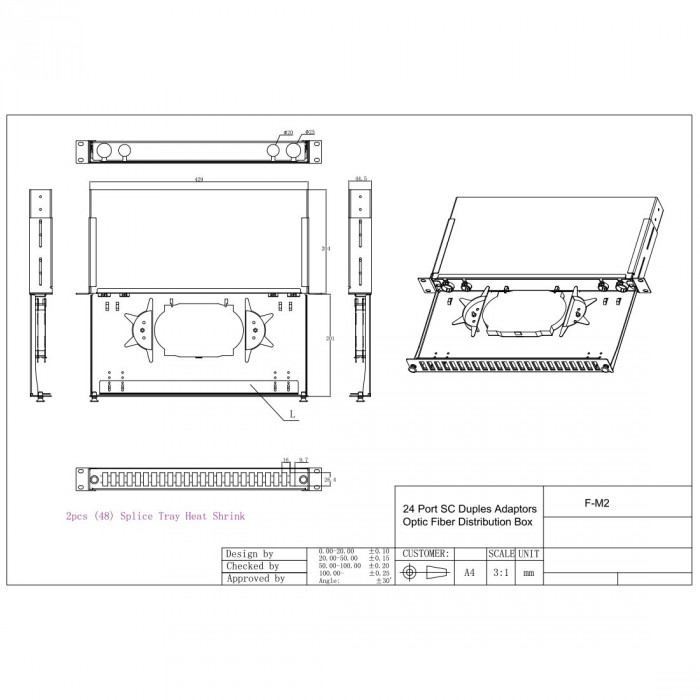 Корпус кросса выполнен из металла. На задней стенке корпуса расположены два кабельных ввода с заглушками. На лицевой стороне установлена металлическая адаптерная планка, позволяющая устанавливать до 24 адаптеров SC Duplex.Внутри кросса установлена сплайс-кассета, которая расчитана на размещение до 48 гильз КДЗС. Использование органайзеров положительно сказывается на удобстве эксплуатации и обслуживания активного и пассивного оборудования.