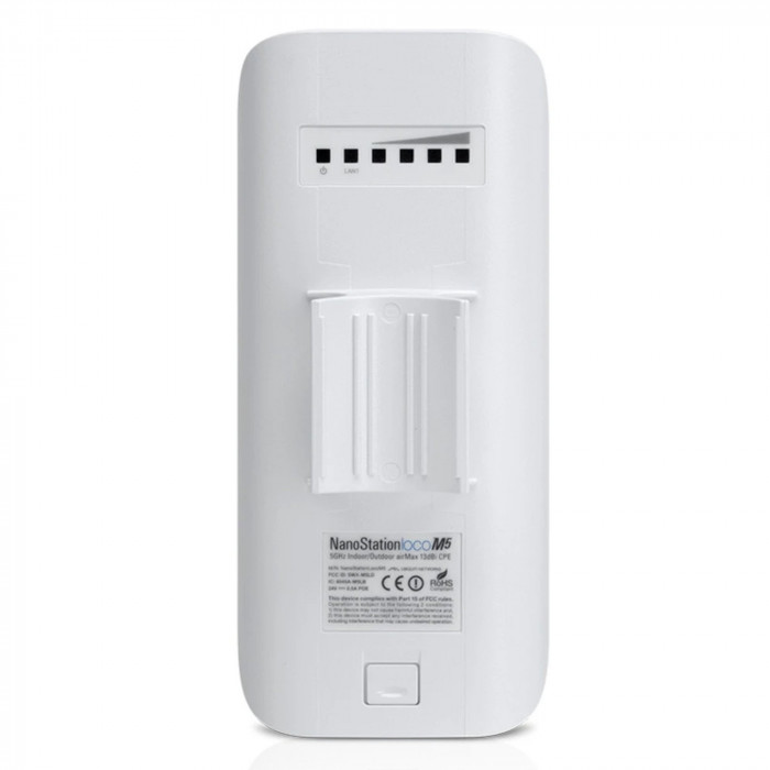 Ubiquiti NanoStation LOCO M5 — компактная уличная/внутренняя Wi-Fi точка доступа / CPE диапазона 5 ГГц стандарта 802.11a/n, с направленной антенной, обеспечивающая беспроводную передачу до ≈150 Мбит/с, поддержкой Passive PoE и возможностью работы в различных режимах (AP, Station, Bridge). Подходит для создания радиомостов на небольшие и средние расстояния.
