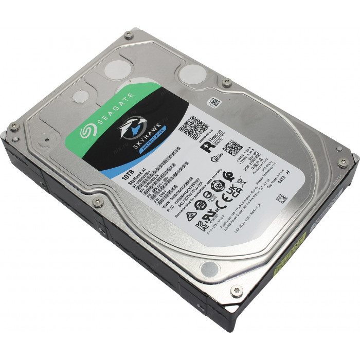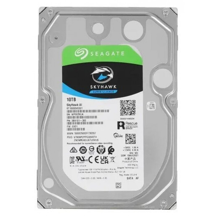 Жёсткий диск Seagate SkyHawk AI ST10000VE001 — высокоёмкий 10 ТБ HDD форм-фактора 3.5" с интерфейсом SATA III 6 Гбит/с, скоростью вращения 7200 об/мин и буфером 256 МБ, оптимизированный под системы видеонаблюдения с ИИ-а...